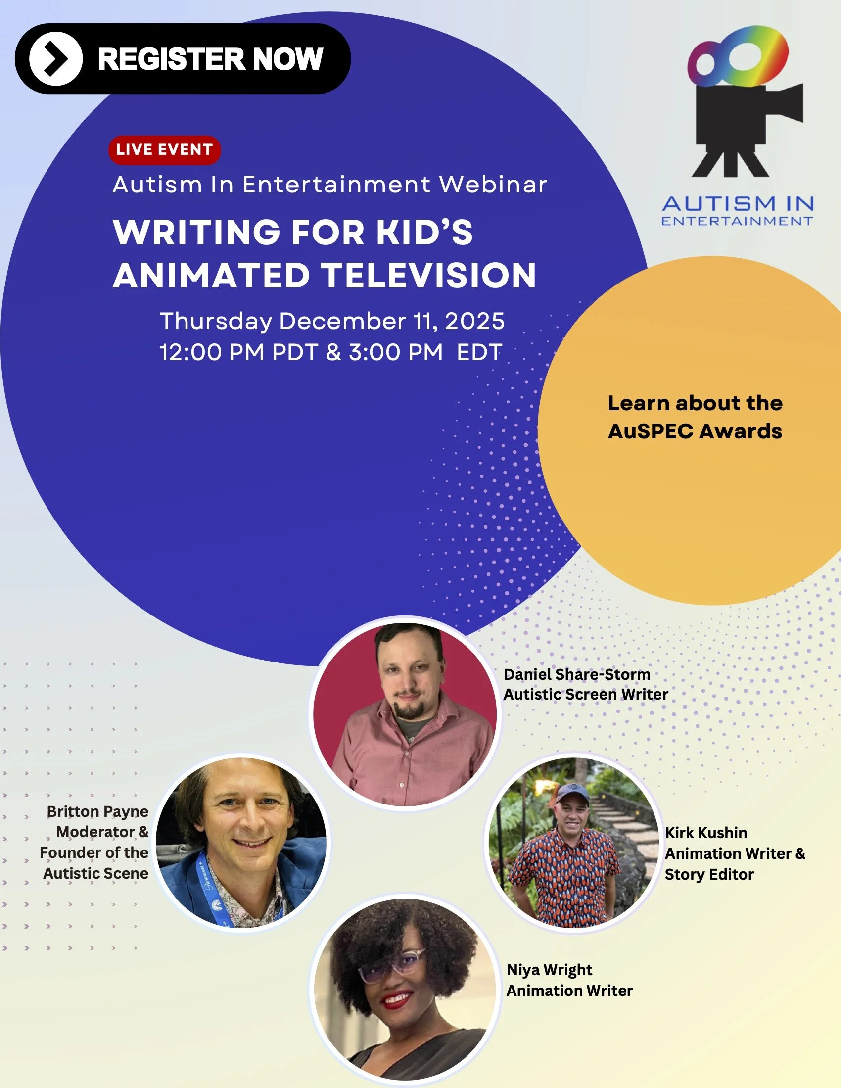 The Autism Scene will be holding a kids animated series spec script competition starting in December 2025, culminating in the AuSPEC AWARDS ceremony on April 2, 2026 in Burbank. Category winners will win meetings with animation executives, showrunners, and/or managers, including from agencies like Gersh, management companies like Gotham, Verve, and kids animated shows like Avatar: The Last Airbender, Lego Friends, Hello Kitty, Monster High, and more! The AuSPEC AWARDS will culminate in a Grand Prize of $5,000. Each script should be an episode of a recent animated show, and have at least one series regular meaningfully interacting with an explicitly autistic character. Autistic characters should be in every type of show — comedy, drama, sci-fi, romance, YA, fantasy, everything! — and the AuSPEC AWARDS will show the industry how it’s done!
